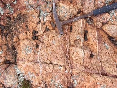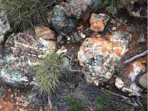 Quartz veins of both straight and wavy styles were found over a large area at Nankivel South along with crackle breccias and polymict breccias within pyritic altered volcanic outcrops (Photographs A - D).