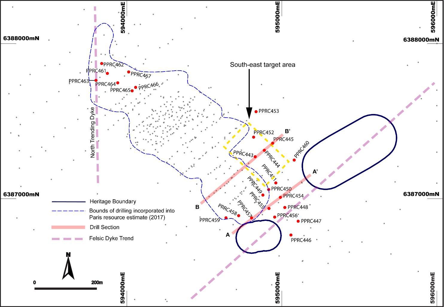 Drilling at the south end of the Paris deposit delivered positive results, showing continuity and potential extensions to the silver-mineralised breccias along (Figure 2 in link below) and south of the southern dyke (Figure 1 in link below).