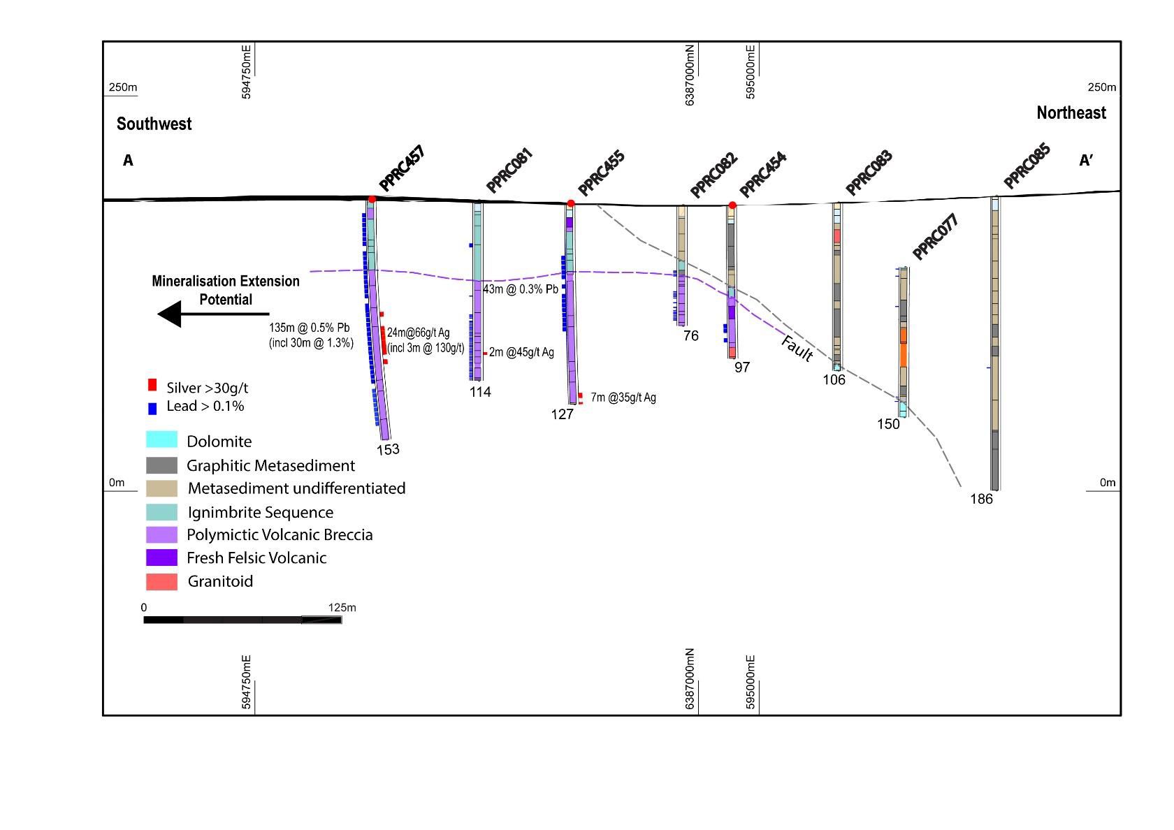 The drilling of seven holes at the north end achieved silver intersections in three holes with more extensive lead intersections. The holes intersected a mix of breccias and dykes indicative of structural complexity in the northern part of the deposit. A northerly trending felsic dyke which was interpreted to cross cut the mineralisation at an oblique angle has been confirmed. There is potential for the silver mineralisation to continue on the north-westerly side of the dyke under prior shallow drilling. The current IP surveying includes traverses in this area that will guide further drilling.