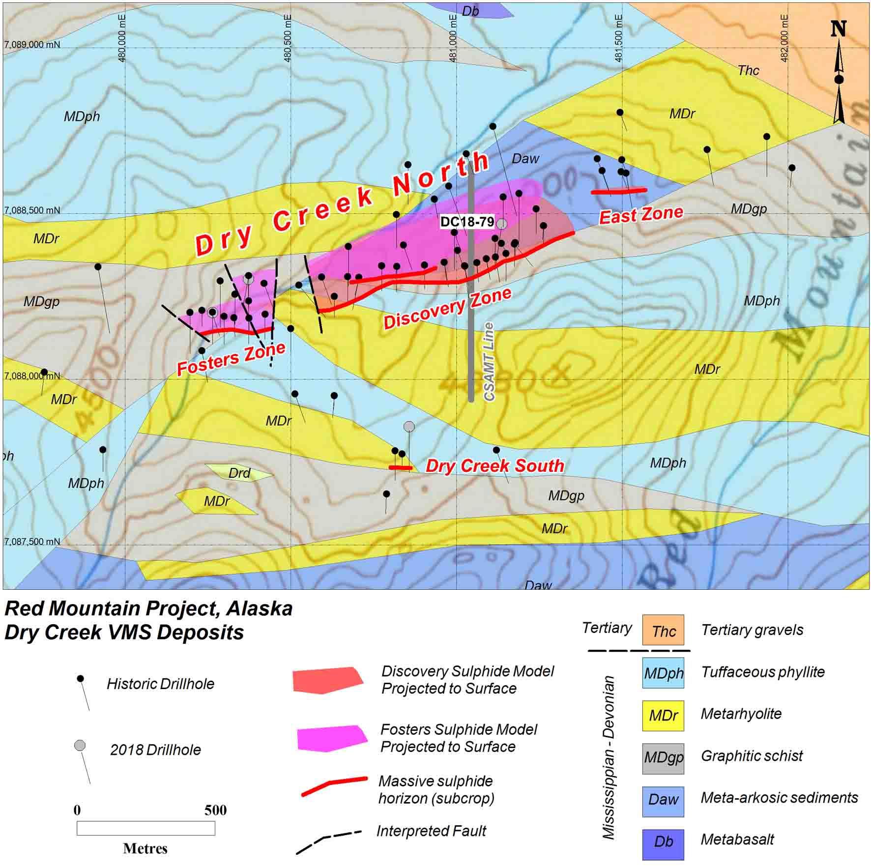 - VMS deposits typically occur in clusters ("VMS camps"). Deposit sizes within camps typically follow a log normal distribution, and deposits within camps typically occur at regular spacing. The known deposits at Dry Creek and West Tundra Flats provide valuable information with which to vector and target additional new deposits within the Red Mountain camp.