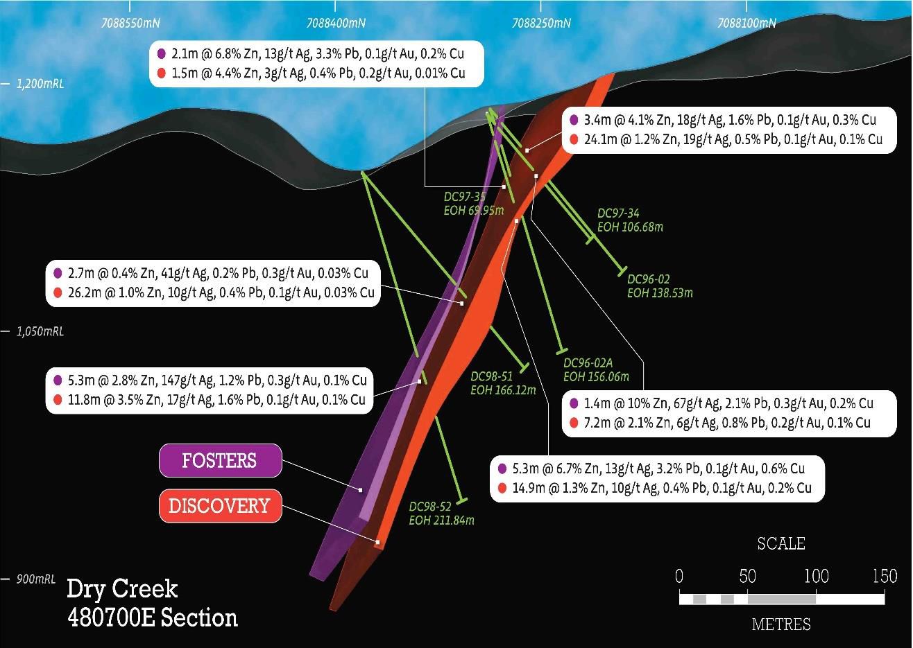 - Drilling to test for down dip extensions at the Dry Creek zinc VMS deposit intersects massive sulphide mineralisation at the Discovery lens,