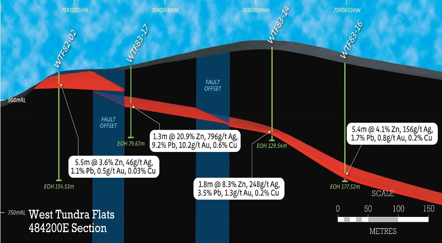 - White Rock used historical drilling to determine a maiden JORC 2012 Mineral Resource estimate for the Dry Creek and West Tundra Flats deposit (ASX Announcement 26th April 2017). The Inferred Mineral Resource contains an impressive base metal and precious metal content with 678,000t zinc, 286,000t lead, 53.5 million ounces silver and 352,000 ounces gold.