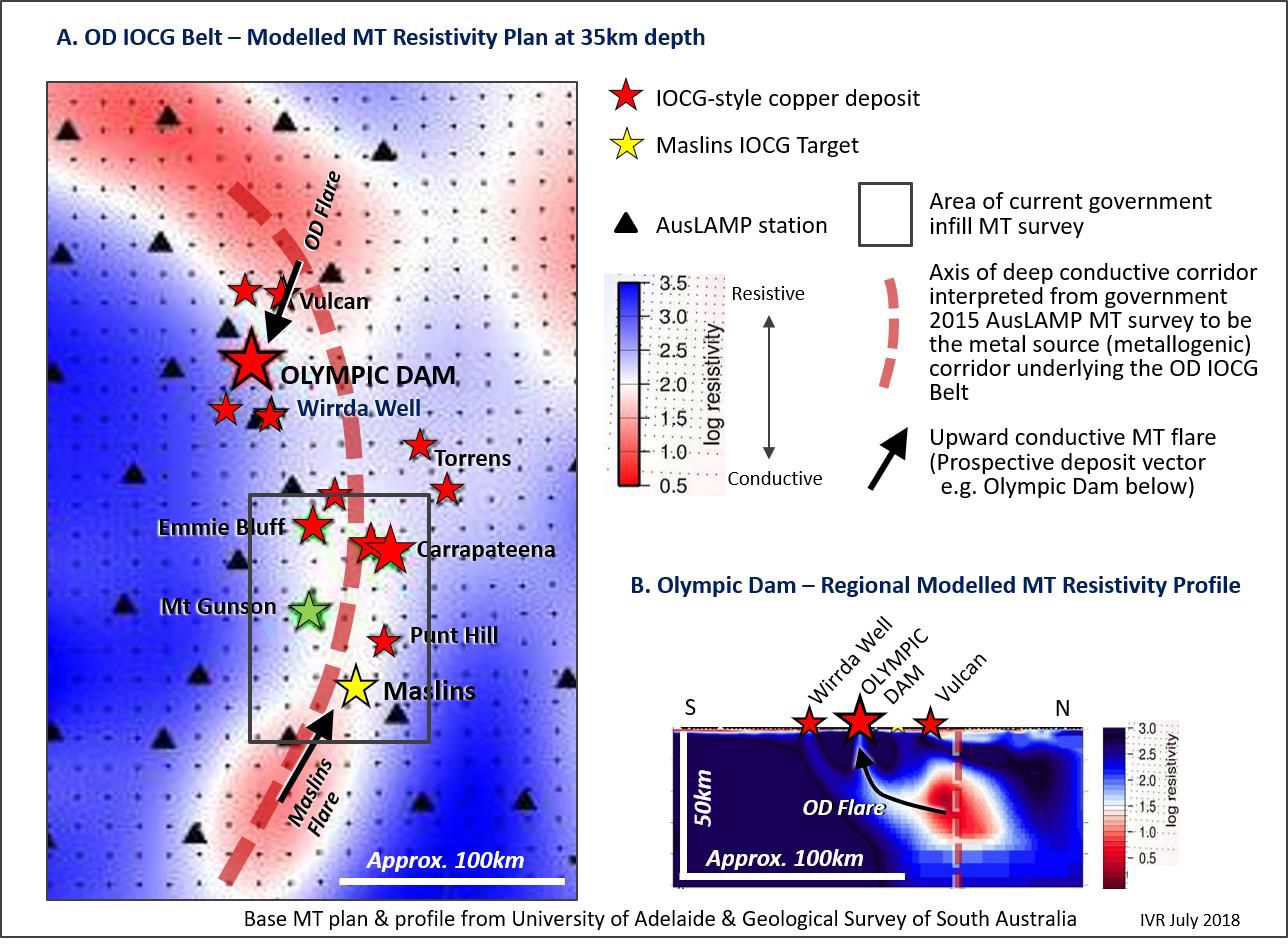 Investigator Resources Limited Managing Director John Anderson said "These exciting results, confirming the MT hotspot under our Maslins target, gives Investigator a front position for a new generation of potential copper-gold discoveries in South Australia. The MT targeting tool recently developed by local research now enables revitalised 3D exploration. With this breakthrough technology in high demand, the planned survey was delayed several months. We now have the data that are interpreted to show the Maslins target is upgraded by a prospective MT vector similar to the signature at Olympic Dam."