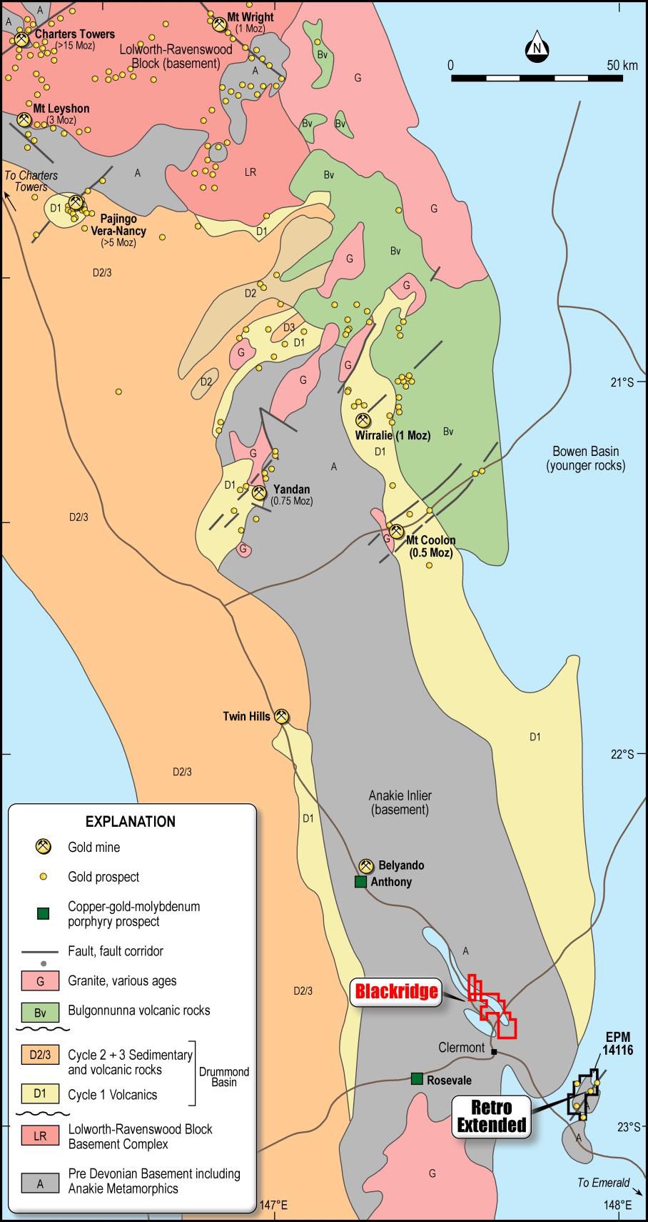 The gold produced at Blackridge was mostly hosted in basal conglomerates of Permian-aged sedimentary basins which include the mined coal measures that unconformably overlie the Anakie metamorphic rocks of Middle Ordovician age and older (see Figures 4 and 5 in link below).