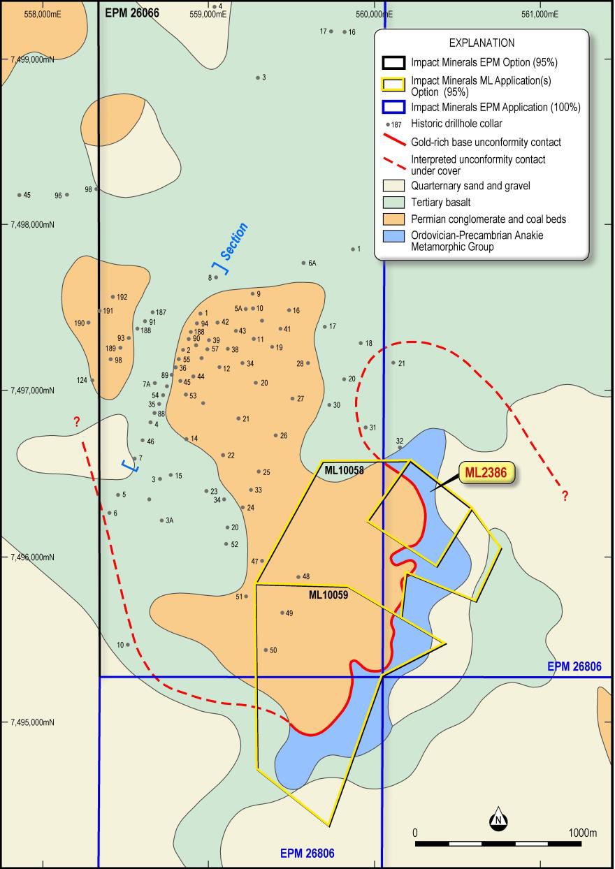 Impact's project covers 91 square kilometres and comprises one 100% owned Exploration Permit (E28806) and one Exploration Permit (E26066) and four Mining Lease applications (ML 100158, 59, 60 and 61) for which Impact has an option to buy 95% from Rock Solid Holdings Pty Limited (see Figures 4 and 5 in link below; ASX Release May 29th 2018).