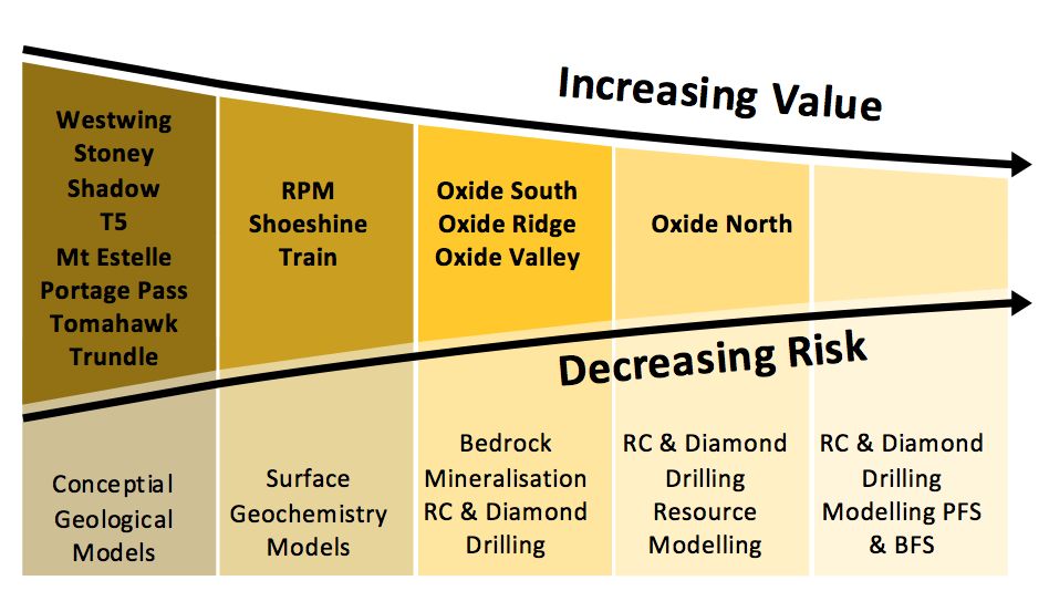 The Company's ranked and prioritised systematic exploration strategy and activities at Estelle are guided by an exploration "Project Pipeline" process to maximise the probability of multiple major discoveries (see Table 1 in link below). Each Milestone is defined by a specific deliverable and has each criteria needs to be ticked to determine which prospect must pass through before moving to the next Milestone. Economic criteria and probability of success increase as projects move along the pipeline. The methodology helps to ensure work is carried out across all stages of the process, cost are kept minimal and that focus is kept on the best quality targets and that the pipeline is kept full with early Milestone projects.