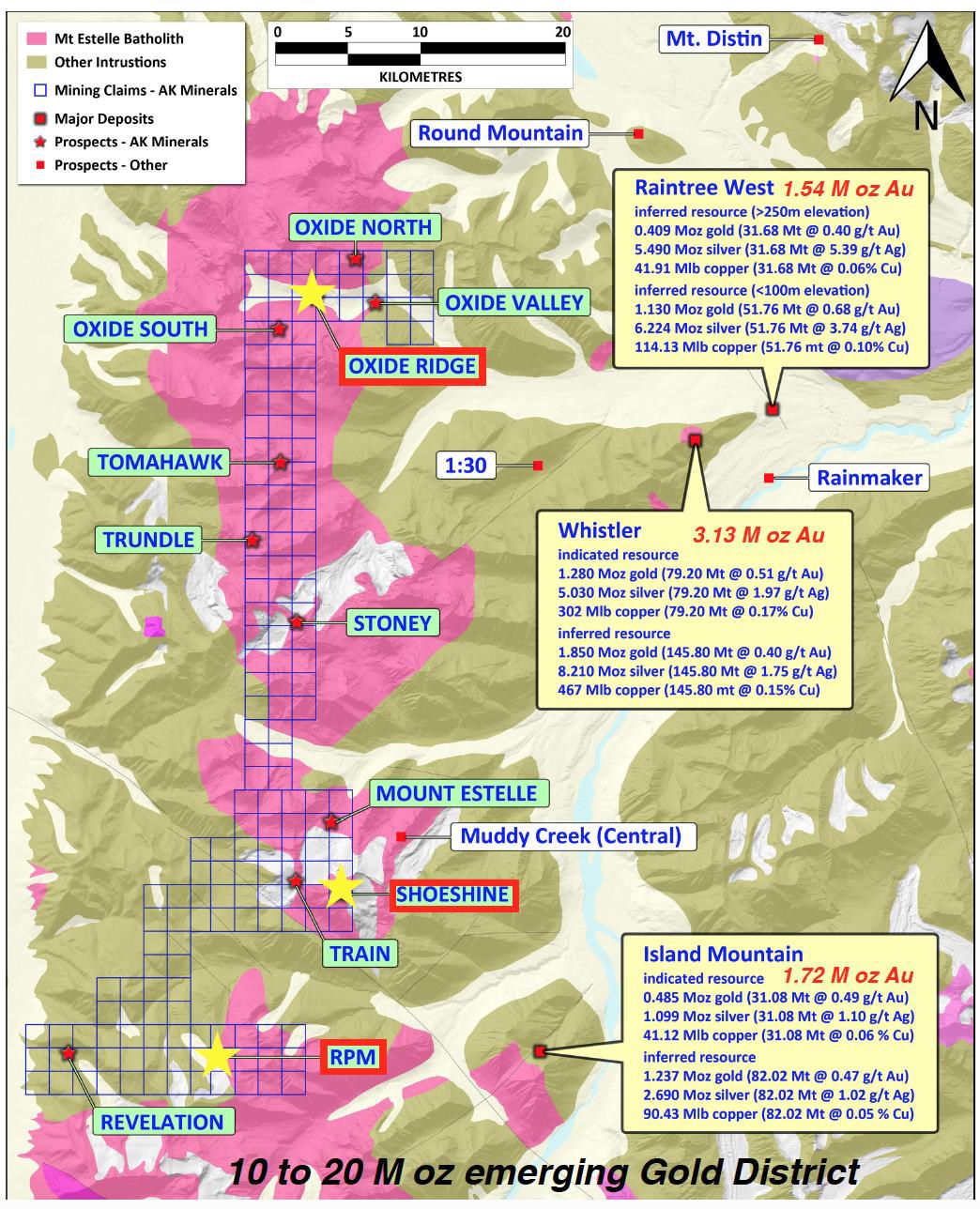 The 112km2 Estelle landholding sits adjacent to the Whistler project (+ 9.5 Moz AuEq) held by Gold Mining Inc. and in the same assemblage of rocks that hosts Northern Dynasty's giant Pebble copper-gold-molybdenum-silver deposit (105 Moz Au). A direct correlation between gold grade and vein density is similarly reported at the Fort Knox (+ 4 Moz) and Dublin Gulch (+ 6 Moz) RIRGS deposits (Hart, 2007). Study results suggest that the 1) association of Au with Bi-Te, 2) association of Au with sheeted veins containing arsenopyrite, and 3) restriction of alteration to narrow selvages adjacent to veins at the Estelle Property are consistent with the genetic deposit model for RIRGS(see Note below).