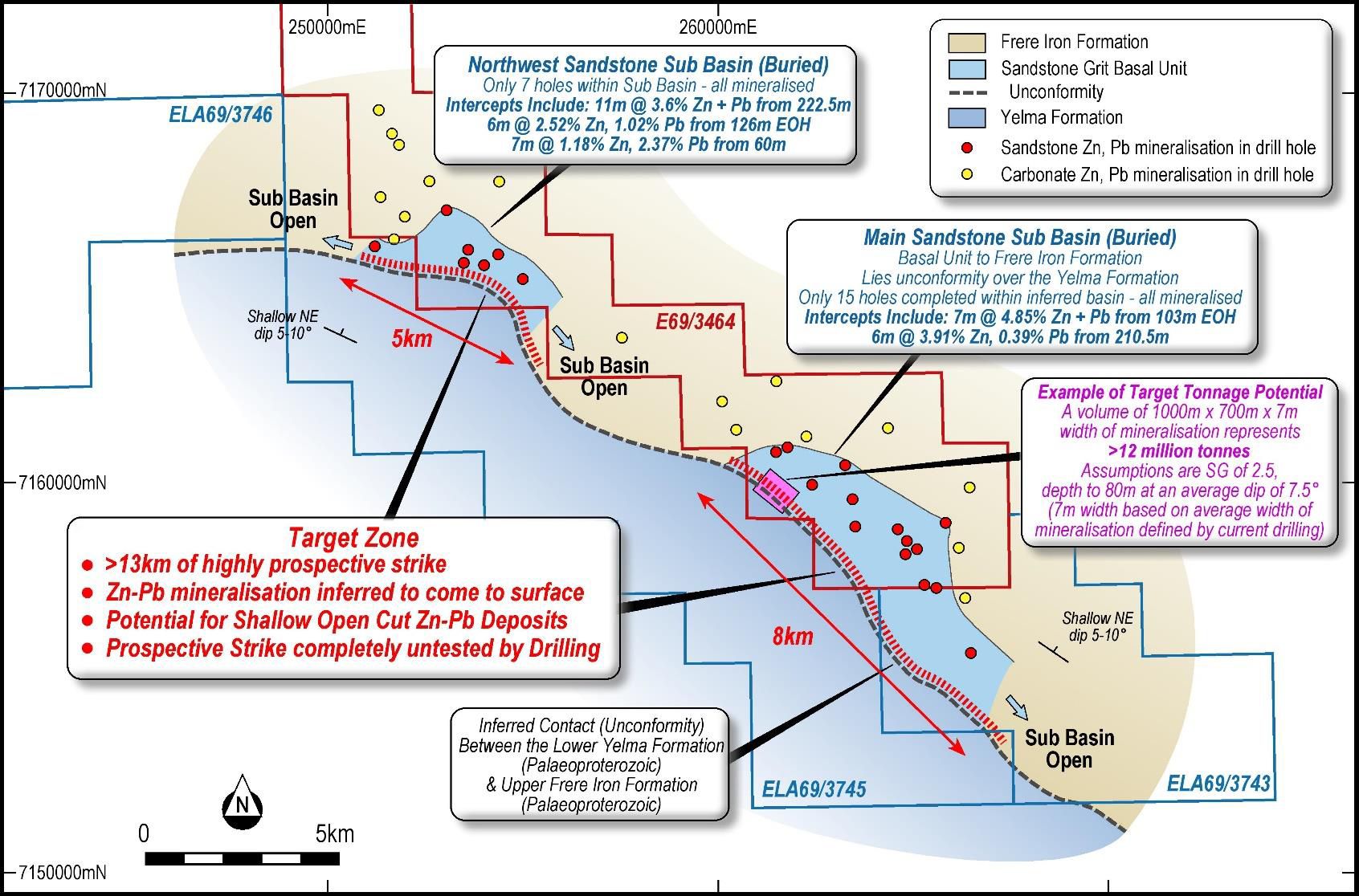 Over 13km of prospective strike (see image 2) of potential shallow Zn-Pb mineralized sandstone has been identified where the unconformity comes to surface. The prospective strike is completely open. All previous exploration (drill holes) has focused on MVT (Mississippi Valley Type) Zn-Pb mineralisation hosted within the Navajoh Dolomite (upper unit of the Yelma Formation). No drill hole has tested the up-dip to surface expression of the Zn-Pb bearing sandstone unit within the sub basins.