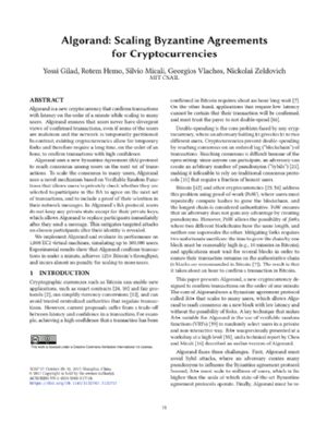 Algorand (CRYPTO:ALGO) 是MIT機械工程與計算機科學系Silvio Micali教授與合作者於2016年提出的一個區塊鏈協議,主要是為了解決比特幣區塊鏈採用的pow共識協議存在的算力浪費,擴展性弱、易分叉、確認時間長等不足。