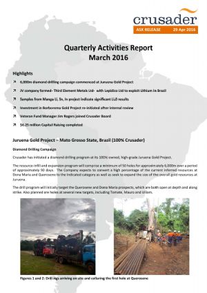 Crusader Resources Limited (ASX:CAS) is a minerals company focussed on the identification, acquisition, development and operation of projects in Brazil. Crusader believes that Brazil is a vastly underexplored country with high potential for the discovery of world class mineral deposits. The company has already acquired a diverse portfolio of projects including gold, iron ore, tin, tungsten and uranium and continues to utilise its strong networks in Brazil to identify new opportunities.