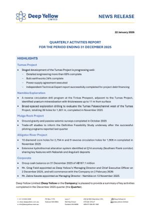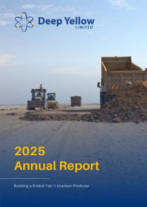 Deep Yellow Limited (ASX:DYL) (OTCMKTS:DYLLF) is successfully progressing a dual-pillar growth strategy to establish a globally diversified, leading uranium company producing 10+ Mlb pa. The Company's portfolio consists of two advanced projects in Tier-1 uranium mining jurisdictions - flagship Tumas in Namibia and Mulga Rock, Western Australia.