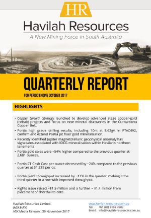 Havilah Resources Ltd (ASX:HAV) is a debt free South Australian gold producer having recently financed and developed its first gold mine at Portia in north-eastern South Australia. It plans to follow on with three copper-gold-cobalt mining developments at North Portia, Kalkaroo and Mutooroo, which are underpinned by a JORC resources mineral inventory of over 1.4 million tonnes of copper, 3.6 million ounces of gold, and 18,000 tonnes of cobalt.
