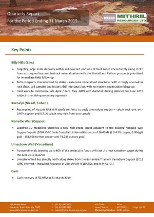 In the Murchison, Mithril is exploring for copper, nickel and zinc mineralisation on the Nanadie Well Project and for copper, silver, zinc and lead on the Bangemall Base Metal Project. Mithril's exploration partner – Monax Mining Ltd is also exploring for vanadium on the Limestone Well tenements.