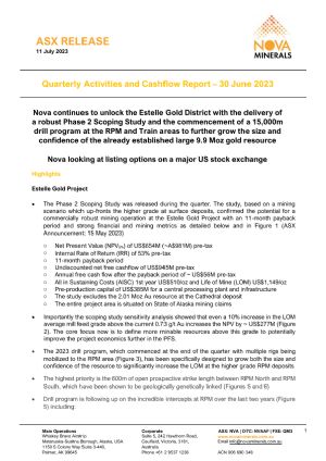 Nova Minerals Limited (ASX:NVA) (FRA:QM3) is a Gold, Antimony and Critical Minerals exploration and development company focused on advancing the Estelle Project, comprised of 514 km2 of State of Alaska mining claims, which contains multiple mining complexes across a 35 km long mineralized corridor of over 20 advanced Gold and Antimony prospects, including two already defined multi-million ounce resources, and several drill ready Antimony prospects with massive outcropping stibnite vein systems observed at surface. The 85% owned project is located 150 km northwest of Anchorage, Alaska, USA, in the prolific Tintina Gold Belt, a province which hosts a >220 million ounce (Moz) documented gold endowment and some of the world's largest gold mines and discoveries including, Barrick's Donlin Creek Gold Project and Kinross Gold Corporation's Fort Knox Gold Mine. The belt also hosts significant Antimony deposits and was a historical North American Antimony producer.