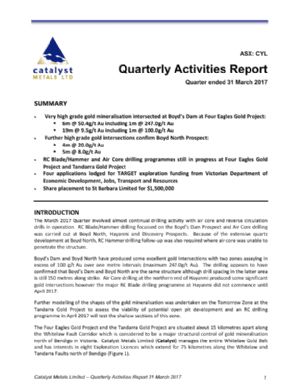 Catalyst has established a dominant position in one of the best gold provinces in Australia and controls a strike length of almost 80 kilometres along the Whitelaw Gold Belt north of Bendigo in Victoria. The Whitelaw Fault is believed to be an important factor in the formation of the Bendigo goldfield which was the second largest gold producer in Australia with production of 22 million ounces of gold at a grade of 15 g/t Au. Catalyst controls two virgin gold discoveries at Four Eagles and Tandarra where high gold grades up to 100 g/t Au have been discovered at shallow depths of less than 50 metres. A transaction with Gold Exploration Victoria Pty Ltd (a subsidiary of Hancock Prospecting Pty Ltd) will see up to $4.2 million spent on Four Eagles in coming years as well as co-operation with Catalyst on other gold projects in a large designated area.