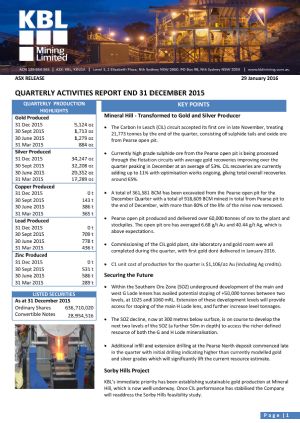 KBL Mining Ltd (ASX:KBL) is an Australian resource Company listed on the ASX with a focus on producing precious and base metals. KBL's main assets include the Mineral Hill copper-gold-silver-lead-zinc mine near Condobolin in New South Wales and Sorby Hills lead-silver-zinc project in Western Australia. The Company has been operating the refurbished processing plant at Mineral Hill since October 2011 to produce copper-gold concentrates and in 2013 commenced producing a separate lead-silver concentrate. Sorby Hills (KBL holds 75% with Henan Yuguang Gold & Lead Co. Ltd (HYG&L) holding 25%) is a large near surface undeveloped silver-lead deposit close to port infrastructure and a short distance from Asian markets.