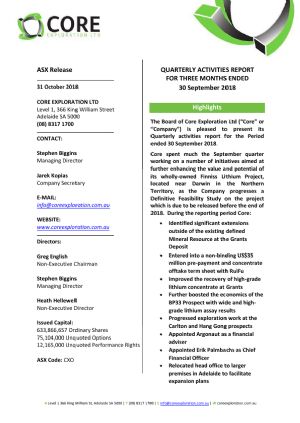 Core Exploration Ltd (ASX:CXO) Quarterly Activities Report 30 September 2018