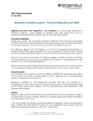 Regeneus Ltd (ASX:RGS) is a Sydney-based clinical-stage regenerative medicine company using stem cell technologies to develop a portfolio of novel cell-based therapies. The regenerative therapies seek to address unmet medical needs in human health markets, focusing on neuropathic pain, including osteoarthritis and various skin conditions, with its platform technologies Progenza(TM) and Sygenus. Visit www.regeneus.com.au for more information.