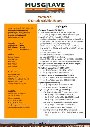 Musgrave Minerals Ltd (ASX:MGV) is an active Australian gold and base metals explorer. The Cue Project in the Murchison region of Western Australia is an advanced gold and copper project. Musgrave has had significant exploration success at Cue with the ongoing focus on increasing the gold and copper resources through discovery and extensional drilling to underpin studies that will demonstrate a viable path to development in the near term. Musgrave also holds a large exploration tenement package in the Ni-Cu-Co prospective Musgrave Province in South Australia.