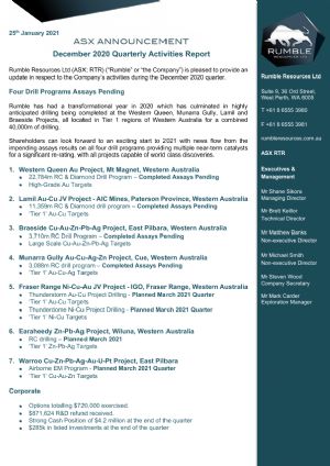 Rumble Resources Limited (ASX:RTR) (FRA:20Z) is an Australian based exploration company, officially admitted to the ASX on the 1st July 2011. Rumble was established with the aim of adding significant value to its current gold and base metal assets and will continue to look at mineral acquisition opportunities both in Australia and abroad.