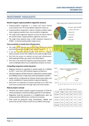 During 2011 Leigh Creek Magnesite Pty Ltd identified that the ground formerly owned by MDL had become available for mining and applied for and was eventually granted two exploration licences over the southern portion of MDL's magnesite deposits.