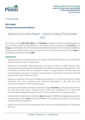 Genex Power Limited (ASX:GNX) is focused on developing a portfolio of renewable energy generation and storage projects across Australia. The Company's flagship Kidston Clean Energy Hub, located in north Queensland, will integrate large-scale solar generation with pumped storage hydro. The Kidston Clean Energy Hub is comprised of the operating 50MW stage 1 Solar Project (KS1) and the 250MW Kidston Pumped Storage Hydro Project (K2-Hydro) with potential for further multi-stage wind and solar projects. The 50MW Jemalong Solar Project (JSP) is located in NSW and provides geographical diversification to the Genex Power Limited portfolio. JSP was energised in early December 2020 and commissioning is now underway. Genex is further developing its energy storage portfolio via the early stage development of a 50MW/75MWh standalone battery energy storage system at Bouldercombe in Queensland. With over 400MW of renewable energy and storage projects in development, Genex is well placed as Australia's leading renewable energy and storage company.