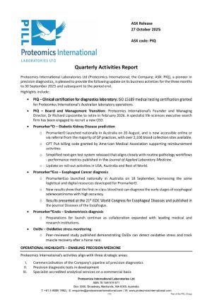 Proteomics International Laboratories (ASX:PIQ) is a wholly owned subsidiary and trading name of PILL, a medical technology company at the forefront of predictive diagnostics and bioanalytical services. The Company specialises in the area of proteomics - the industrial scale study of the structure and function of proteins. Proteomics International's mission is to improve the quality of lives by the creation and application of innovative tools that enable the improved treatment of disease.