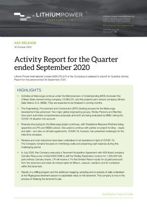 Lithium Power International Ltd (ASX:LPI) Quarterly Activities Report