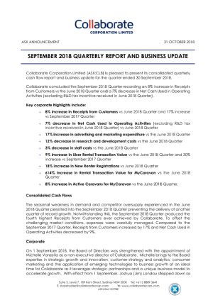 Collaborate Corporation Limited is listed on the Australian Securities Exchange (ASX:CL8). It is Australia's leading listed company focused on 'collaborative consumption', 'peer-to-peer' or 'sharing economy' businesses. Collaborate currently has three core business segments: www.DriveMyCar.com.au Australia's leading peer-to-peer car rental business; www.MyCaravan.com.au Australia's leading peer-to-peer caravan rental business; and www.Mobilise.com an online hire marketplace to unlock the enormous potential of under-utilised assets. Through our proprietary trust and reputation platform, www.peerpass.com.au we create 'trust' between individuals and make it possible for people to safely transact with each other in the sharing economy.