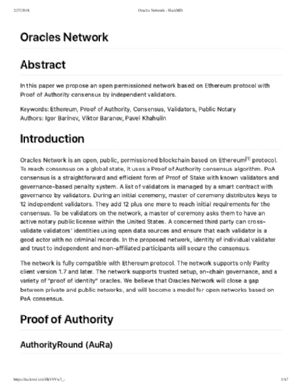 Oracles Network is an open, public, permissioned blockchain based on Ethereum protocol. To reach consensus on a global state, it uses a Proof of Authority consensus algorithm. PoA (CRYPTO:POA) consensus is a straightforward and efficient form of Proof of Stake with known validators and governance-based penalty system. A list of validators is managed by a smart contract with governance by validators. During an initial ceremony, master of ceremony distributes keys to 12 independent validators. They add 12 plus one more to reach initial requirements for the consensus. To be validators on the network, a master of ceremony asks them to have an active notary public license within the United States. A concerned third party can crossvalidate validators' identities using open data sources and ensure that each validator is a good actor with no criminal records. In the proposed network, identity of individual validator and trust to independent and non-affiliated participants will secure the consensus.