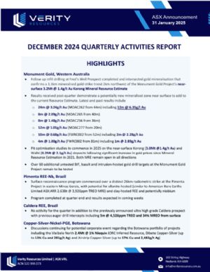 Verity Resources Ltd (ASX:VRL) owns 100% of the Monument Gold project located near Laverton in Western Australia. This project currently has a JORC-compliant (2012) Inferred resource of 3.257 Mt @ 1.4 g/t for 154,000 ounces Au.