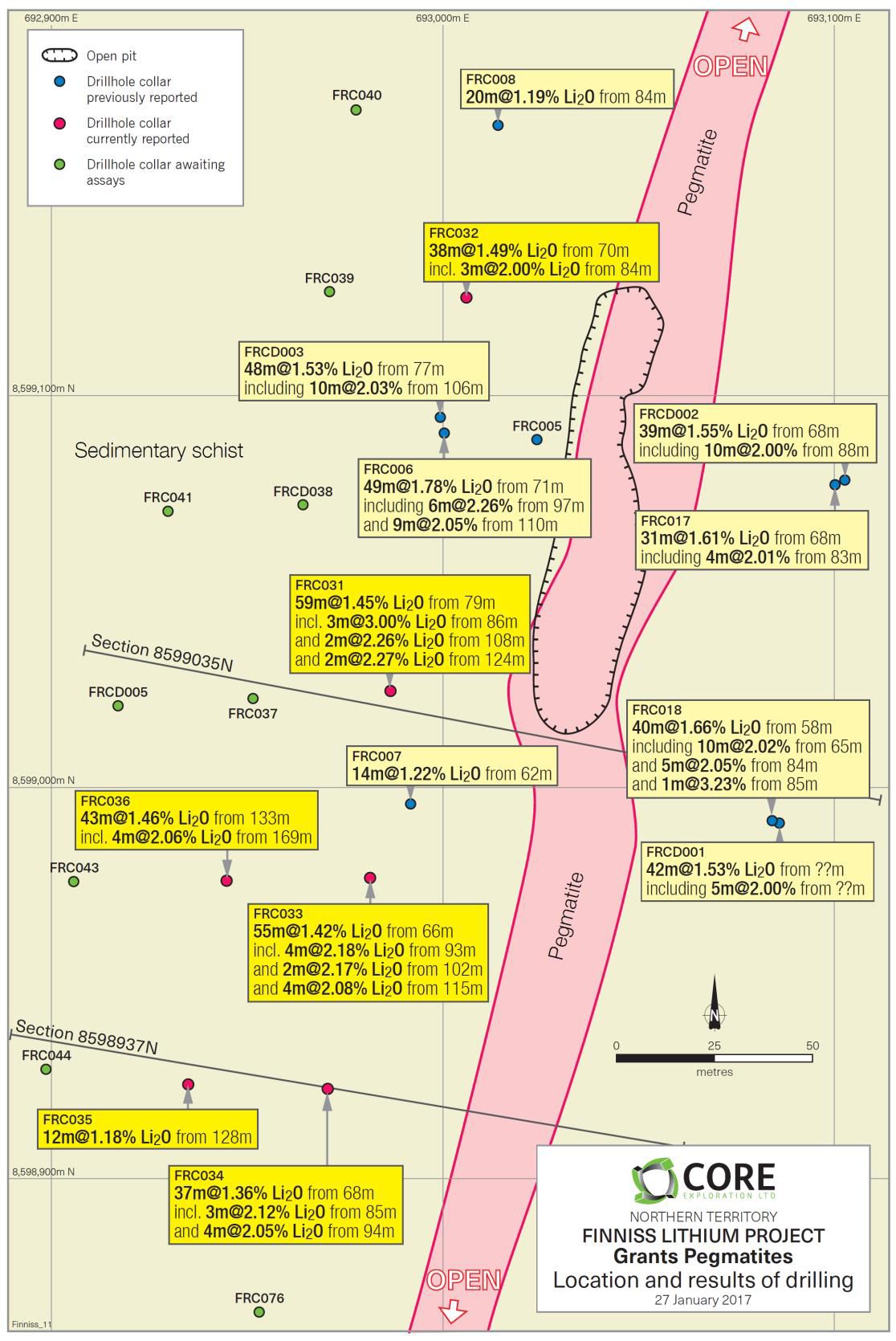 o 钻孔79米深处截穿59米矿体,氧化锂含量为1.45%,包含在3米处2.12%的氧化锂(钻孔FRC031)