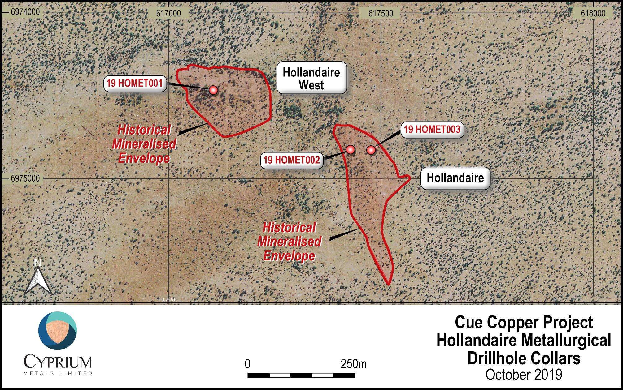 The metallurgical diamond drill programme (refer to CYM ASX announcement dated 14 October 2019) consisted of three holes for 320 metres into the mineralised envelope of the Hollandaire Prospect at the Cue Copper Project to provide representative samples for test-work to be undertaken as illustrated in Figure 1*.