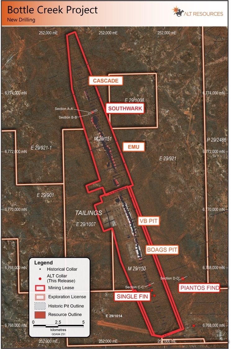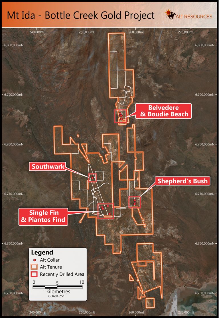 Alt completed a 1,702 metre RC drilling program on 15 March 2020 at the Bottle Creek Gold Project. During the February - March program the Company drilled several prospect areas which have had minimal exploration drilling undertaken by previous explorers, including 9 holes for 758 metres at Southwark, 5 holes for 468 metres at Pianto's Find, and 9 holes for 476 metres at the Single Fin prospect (Figure 2*).
