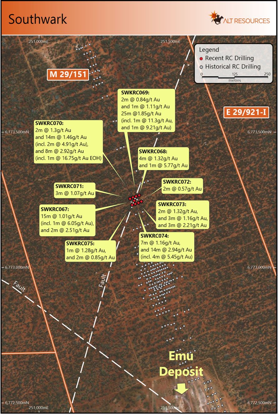 - 23 exploration RC holes for 1,702 metres of drilling completed across Southwark, Pianto's Find and Single Fin areas