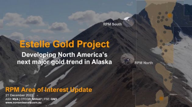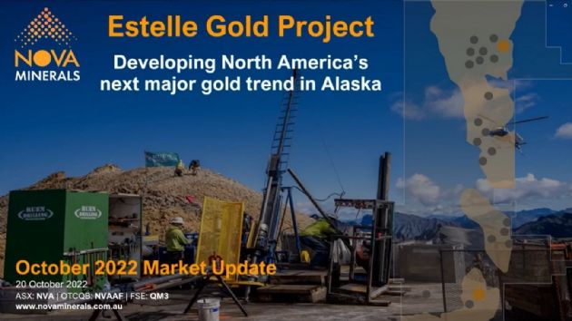 Nova Minerals Limited (ASX:NVA) (FRA:QM3) is a Gold, Antimony and Critical Minerals exploration and development company focused on advancing the Estelle Project, comprised of 514 km2 of State of Alaska mining claims, which contains multiple mining complexes across a 35 km long mineralized corridor of over 20 advanced Gold and Antimony prospects, including two already defined multi-million ounce resources, and several drill ready Antimony prospects with massive outcropping stibnite vein systems observed at surface. The 85% owned project is located 150 km northwest of Anchorage, Alaska, USA, in the prolific Tintina Gold Belt, a province which hosts a >220 million ounce (Moz) documented gold endowment and some of the world's largest gold mines and discoveries including, Barrick's Donlin Creek Gold Project and Kinross Gold Corporation's Fort Knox Gold Mine. The belt also hosts significant Antimony deposits and was a historical North American Antimony producer.