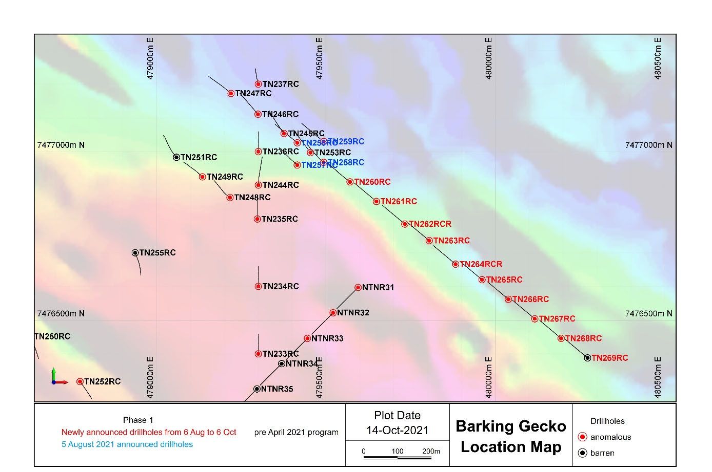 The NW-SE orientated drill line was drilled with holes spaced 100m apart, continuing extending previous anomalous drilling to the southeast with some infilling to 50m with holes TN256RC and TN258RC at its the south-eastern end. Drill hole locations are shown in Figure 2.