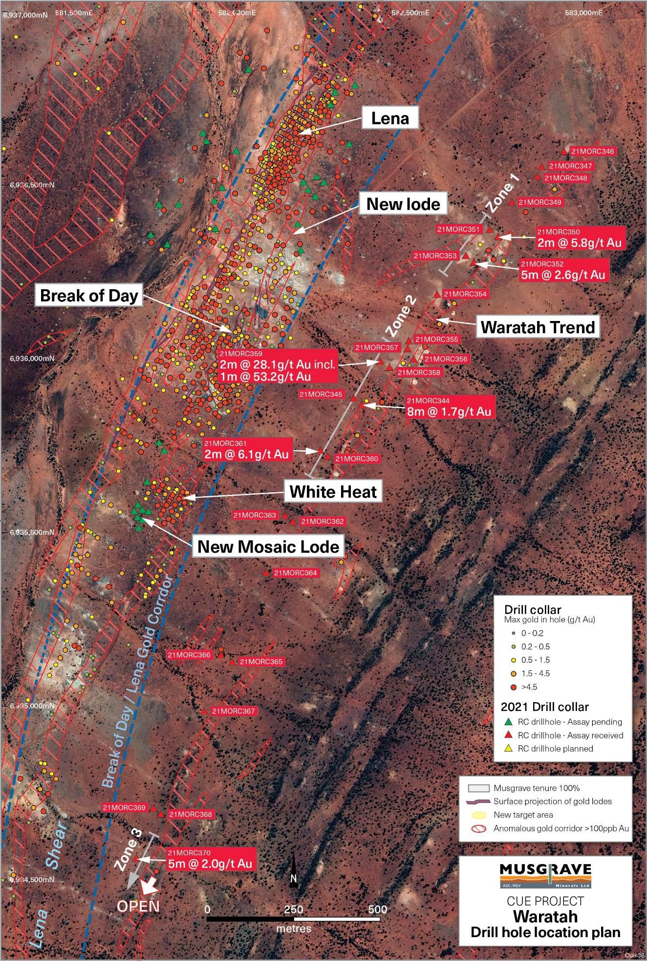 Musgrave Managing Director Rob Waugh said: "These are further strong results and support the upside prospectivity of the Cue Project. We continue to define new targets and hit new mineralised zones. The new Waratah zone is only 400m east of Break of Day. All new intersections sit outside the mineral resource estimates and the drill spacing is still very broad at ~200m with further infill required."