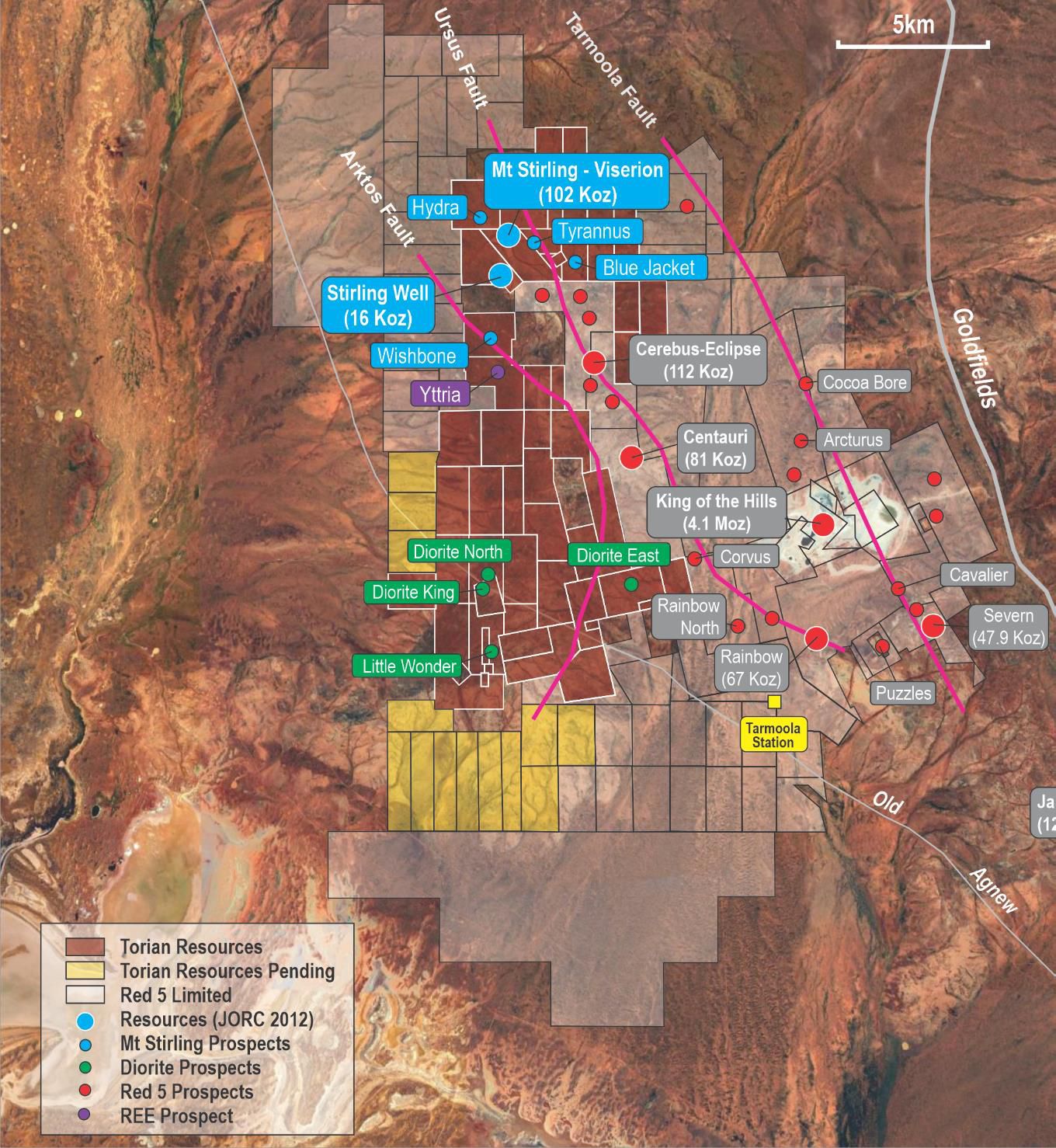 Torian's other projects include the strategically located Mt Stirling and Malcolm Projects in the Leonora region (near Red 5's King of the Hills Project), where it recently completed updated Mineral Resource Estimates and preliminary scoping studies, and a suite of other projects in the Kalgoorlie region including Credo Well JV Zuleika JV, Bonnie Vale, Gibraltar and Mount Monger/Wombola.