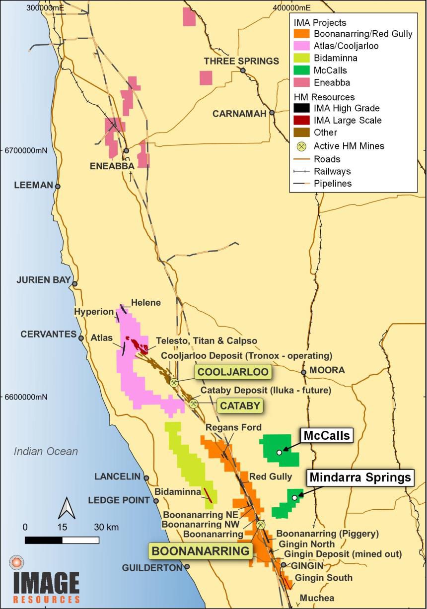 In March 2022, the Company completed the strategic acquisition of the McCalls Mineral Sands Project (see ASX announcement "Strategic Acquisition of McCalls Mineral Sands Project" dated 14 March 2022) from Sheffield Resources Limited (Sheffield). The McCalls project is comprised of two separate deposits; McCalls and Mindarra Springs 10km to the south, and with Mindarra Springs located 10km to the east of Image's Boonanarring project (Figure 1*).
