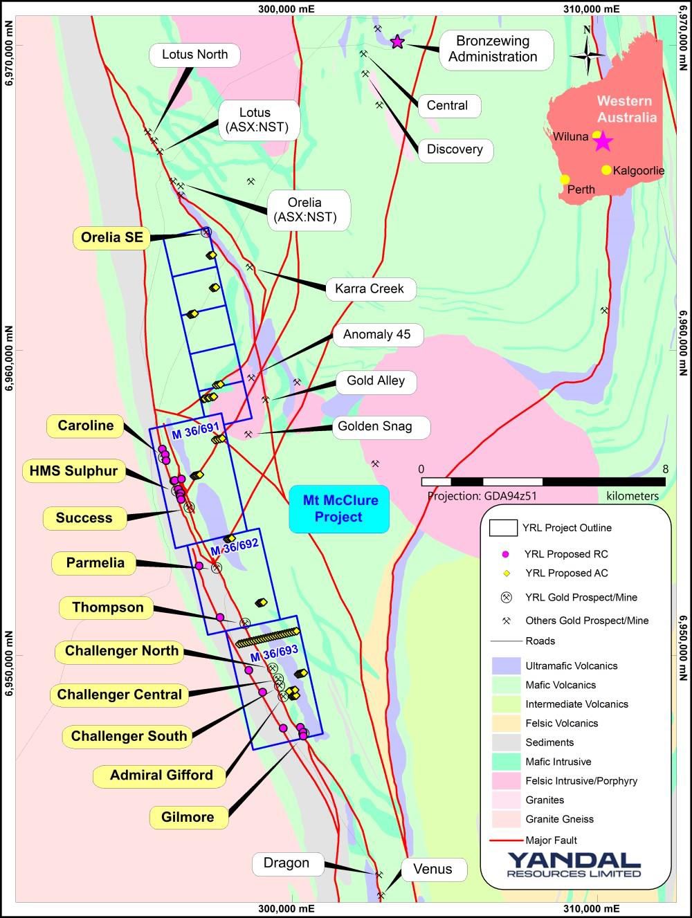 - Mt McClure project (100% YRL) located in close proximity Bronzewing mining infrastructure along established haul roads