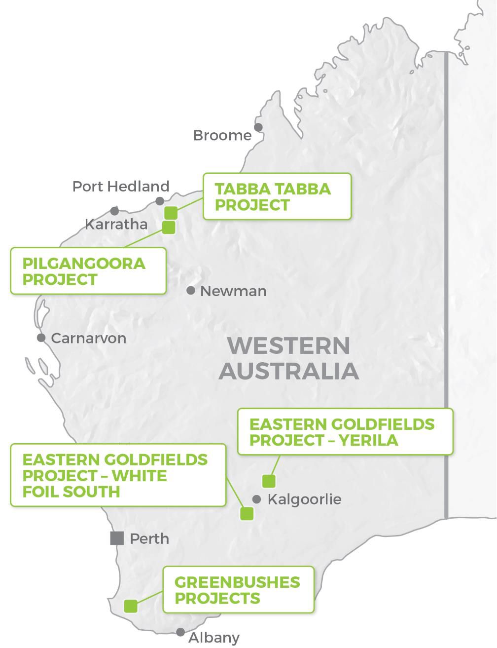 Western Lithium holds tenements in each of the three major WA hard rock lithium areas - Greenbushes, the Pilbara Craton, and the Eastern Goldfields.