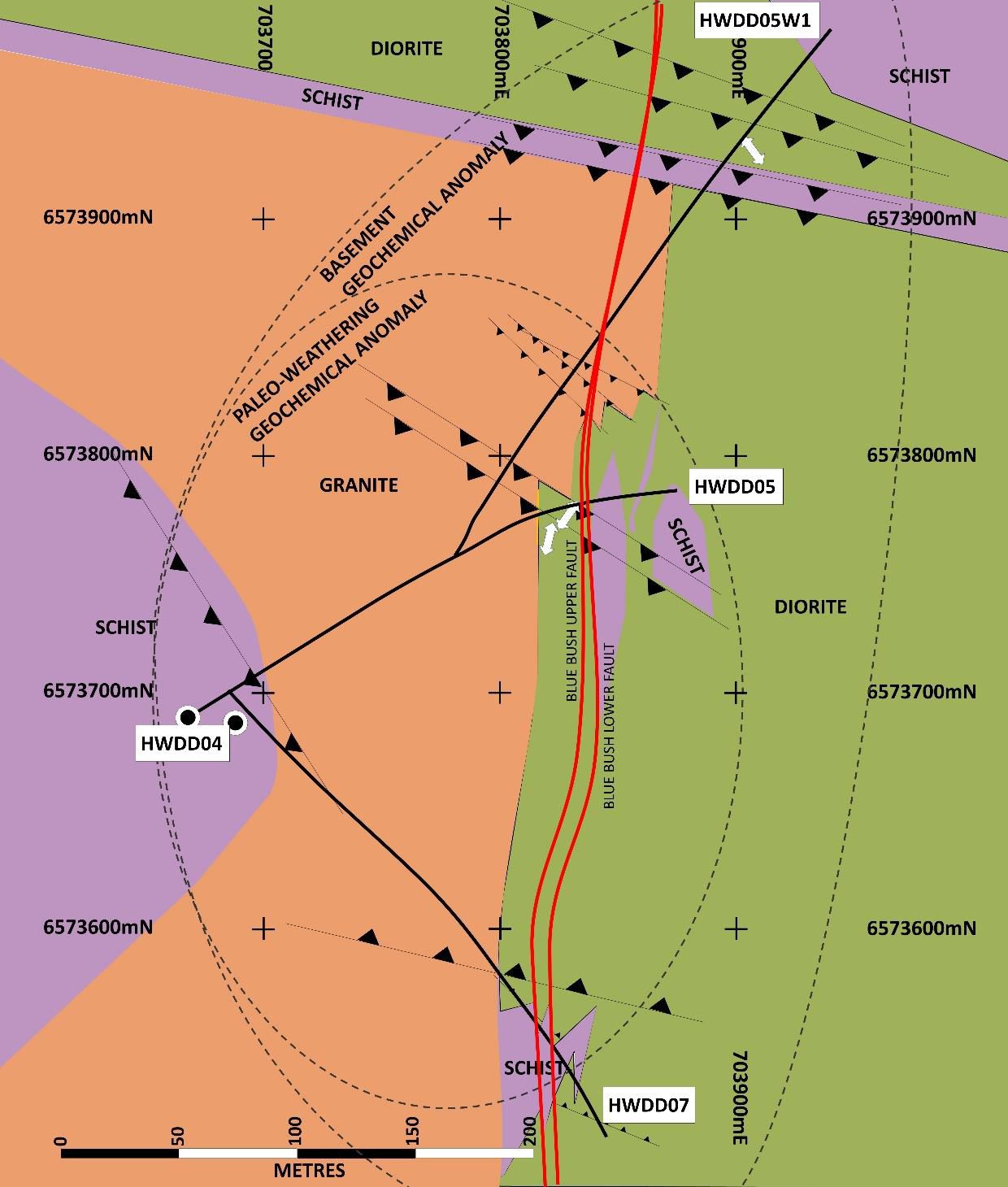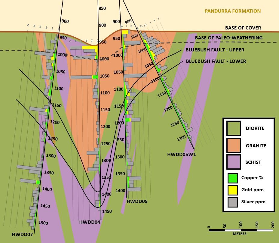 Levels of copper, gold and silver are pervasively and significantly elevated throughout HWDD07 relative to the background geochemical values (Graph 1*), and are indicative of a wider basement geochemical anomaly present in all the Bluebush drilling (Figure 4*) and extends the interpreted anomalous strike length to 500m (Figure 2*).