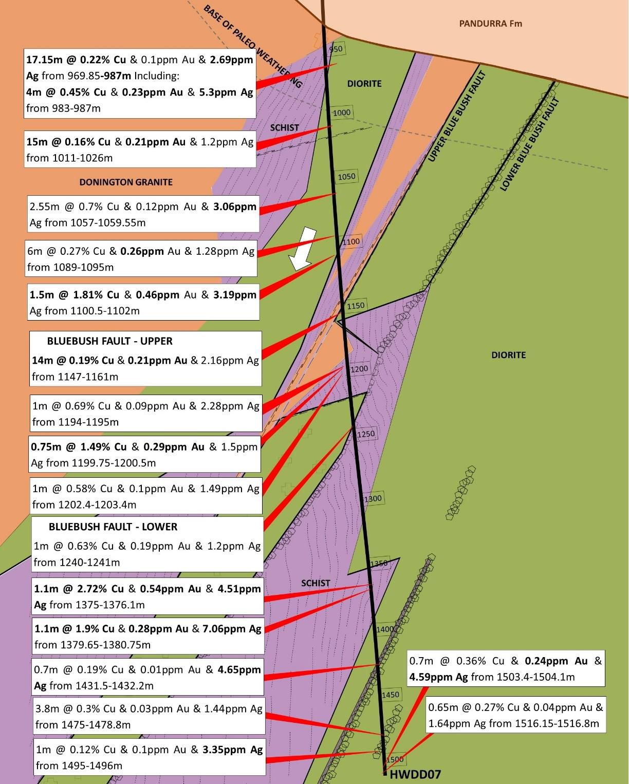 HWDD07 in weathered schist, diorite and granite, with bornite at the base of paleo-weathering o 17.15m @ 0.22% Cu & 0.1ppm Au & 2.69ppm Ag from 969.85-987m