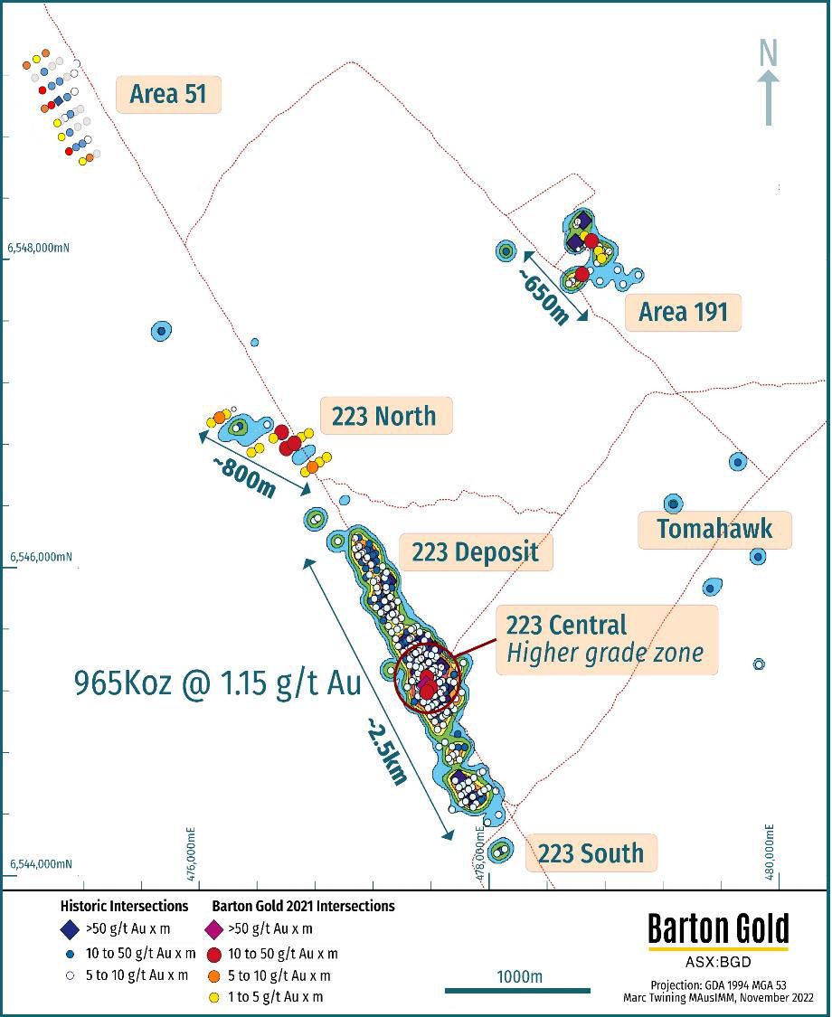 During the quarter Barton received the bulk of results from drilling on the 223 Deposit, and subsequent to quarter end received all assays for drilling on the Area 51 prospect. Results confirmed a total ~800m length of potential 223 Deposit depth extensions, and broad mineralisation at Area 51.2 The Company is currently working on an updated MRE for the 223 Deposit, and is further reviewing Area 51.