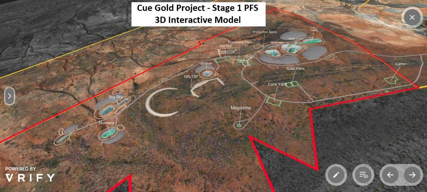 The 3D interactive model is hosted using the VRIFY Technology Platform and includes details of the Cue Gold Project location, topography, resource block models and PFS open pit, underground and infrastructure design. Exploration activities such as drilling, surface geochemistry, geophysical surveys and models of the Company's gold deposits are displayed in an intuitive 3D interface.
