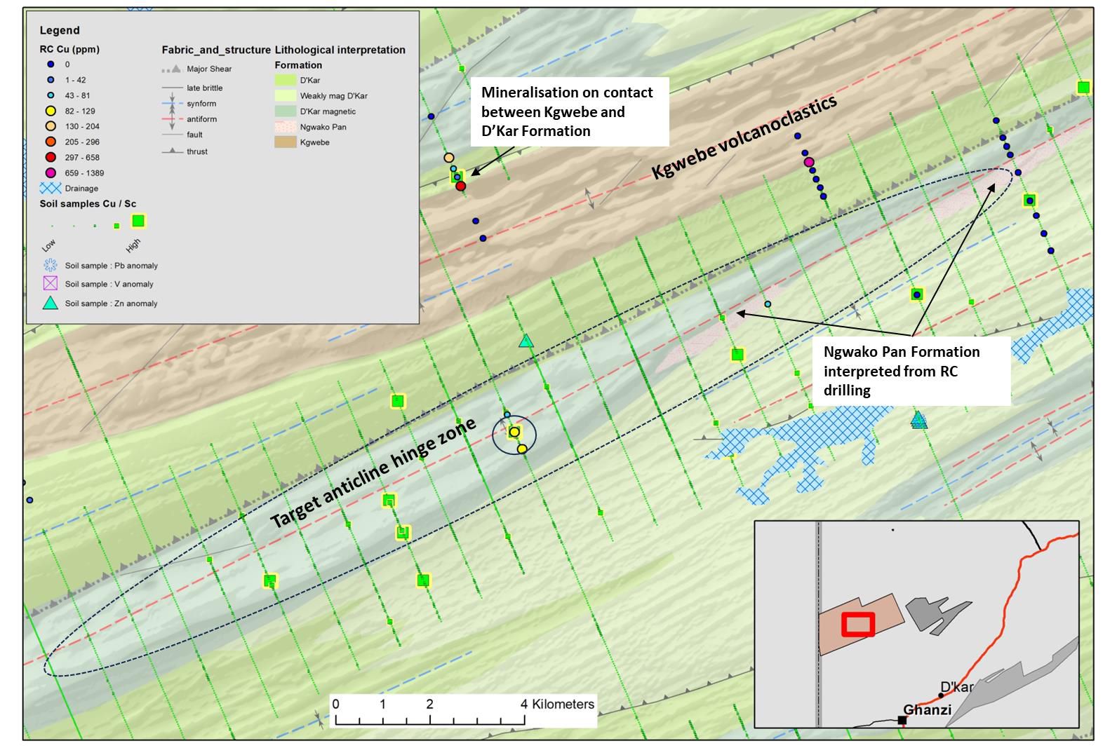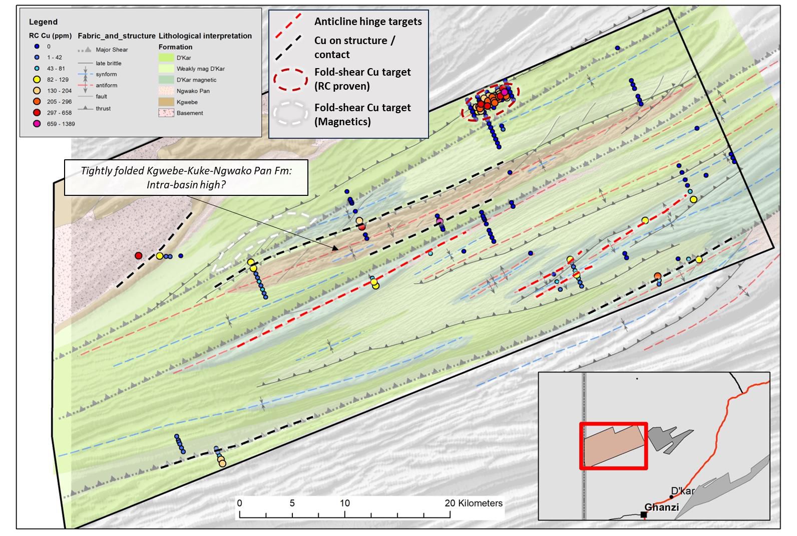 - Infill RC drilling at the Tlou fold target has returned consistent anomalous bedrock copper results increasing the target size to 4km x 1.2km;