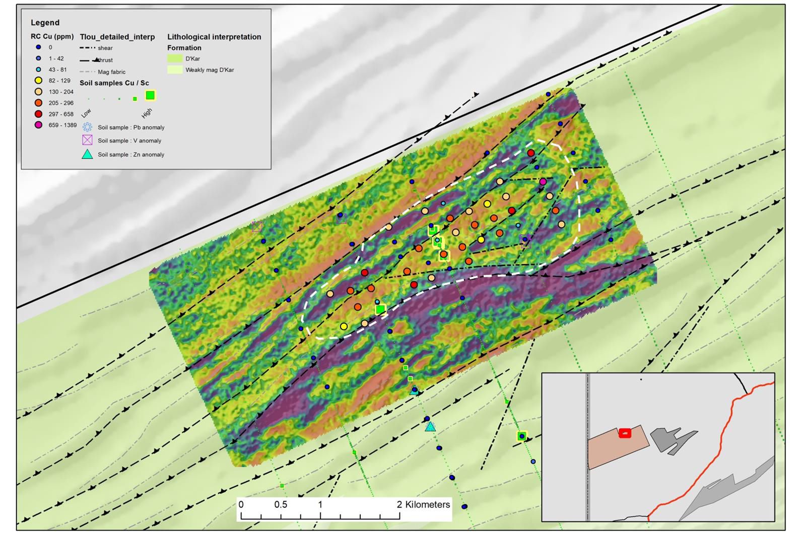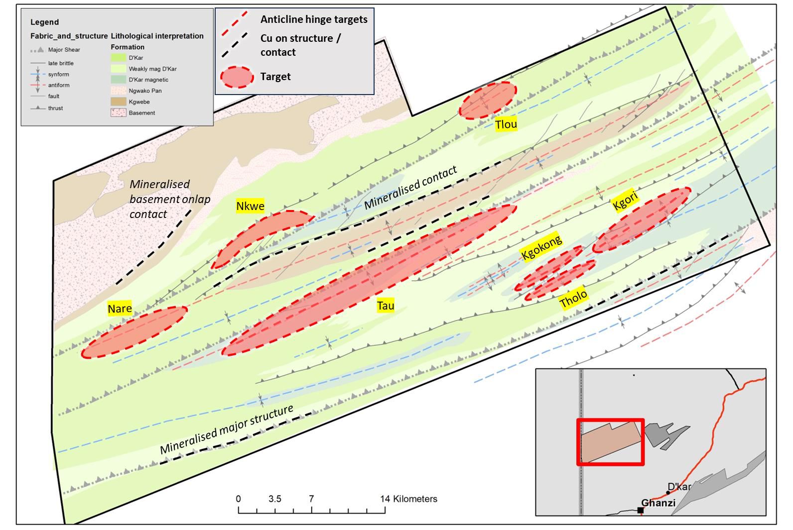 - A larger analogue to the Tlou fold target has been identified in magnetic data highlighting the potential for multiple comparable fold targets in the project area.