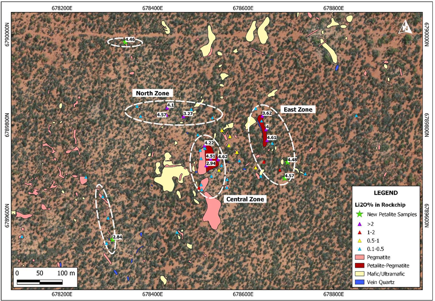 Lithium-rich pegmatites with up to 4.6% Li2O were identified in three main zones (North Zone, Central Zone, East Zone) covering a 300m by 200m area over one of the strongest lithium soil anomalies (up to 833ppm Li2O; Figure 2*). XRD tests confirmed petalite as the lithium mineral in outcropping pegmatites. Petalite (LiAlSi4O10) has a similar composition to spodumene (LiAl(SiO3)2) and is known to occur with spodumene in other lithium deposits in the region (e.g. Mt Holland, Mt Ida; Figure 3*).