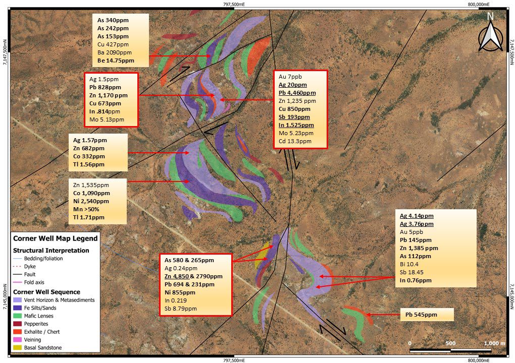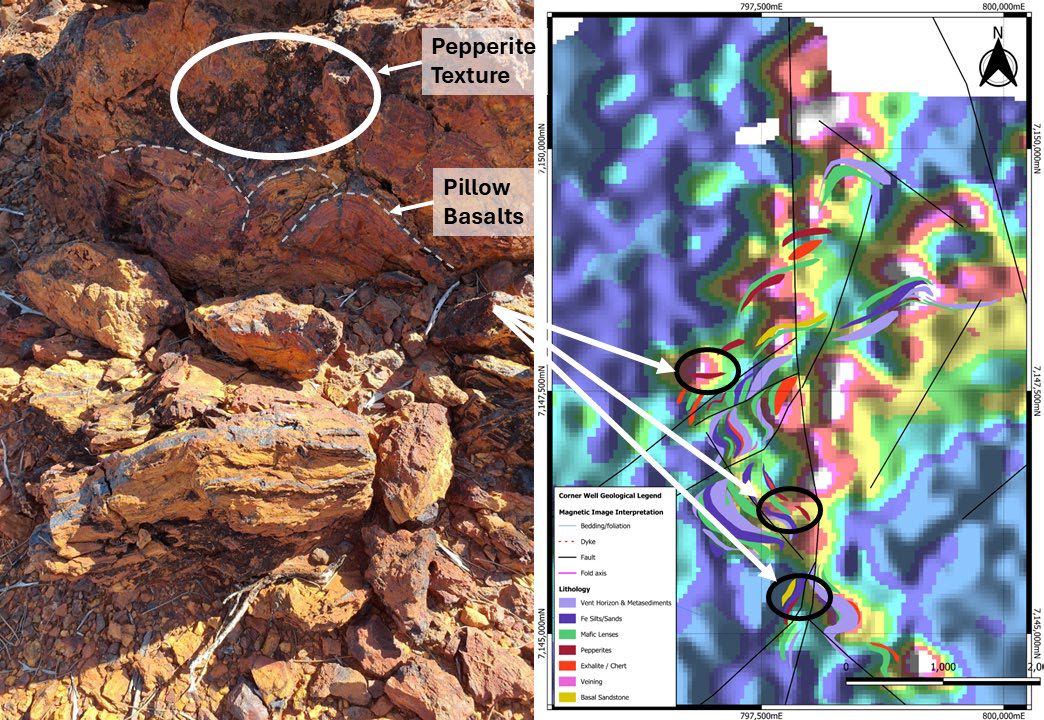 Field mapping and rock-chip sampling was then undertaken to ground truth the soil anomalism, with geological units mapped including sedimentary rocks (siltstones, sandstones, cherts/exhalates) and basaltic volcanic rocks (Figure 3*), of the Killara Formation. The basaltic units included pillow and pepperite textures (Figure 4*), representing sub aqueous deposition. The association between sedimentary and volcanic rocks suggest a deep seafloor geological environment with syngenetic volcanic activity, particularly evident by pillow and pepperite textures within the basaltic units.